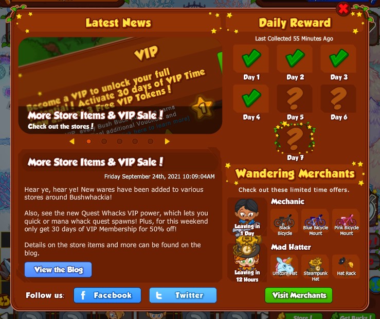 Nickshire (CNE Dev)Last Edited September 24th 2021 at 11:57 AM ![]() New wares have been added to various stores around Bushwhackia! Also, see the new Quest Whacks VIP power, which lets you quick or mana whack quest spawns! Plus, for this weekend only get 30 days of VIP Membership for 50% off! Details on the store items and more can be found on the blog. Would love to hear your thoughts on this update below! |