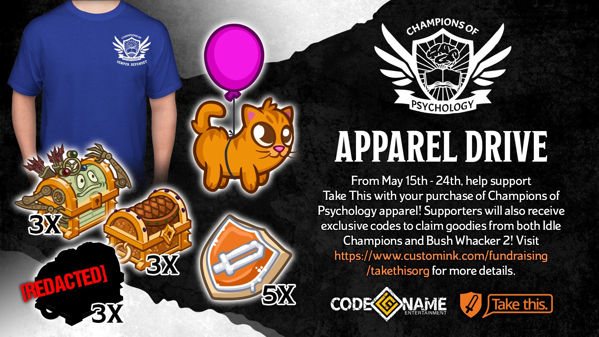 Nickshire (CNE Dev)![]() From Monday, May 15th - Wednesday, May 24th help support Take This with your purchase of Champions of Psychology Apparel! Supporters will also receive exclusive codes to claim goodies from both Idle Champions and Bush Whacker 2! The link to support is here: https://bit.ly/CoPMerch. |