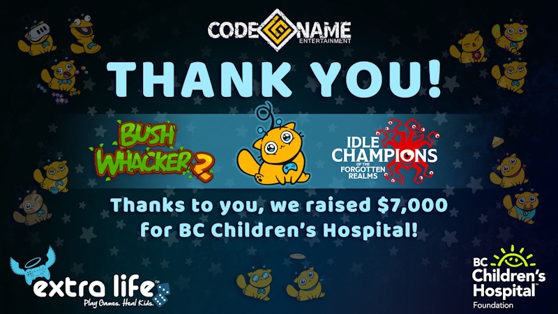Nickshire (CNE Dev)Last Edited November 18th at 4:37 PM ![]() To all of you who donated to our Extra Life campaign: Thank you. It included a in-game packs sold in Bush Whacker 2 and Idle Champions of the Forgotten Realms from November 3-10, as well as a 24 hour livestream on Friday November 7th, where we raised money on our Extra Life page. The livestream in particular was a both fun and exhausting, but above all we've raised $7,000 USD to help sick and injured kids. Of that, the Bush Whacker 2 team was able to raise over $1,300 USD! 100% of the proceeds will be donated to BC Children's Hospital Foundation! Give yourselves a pat on the back! |